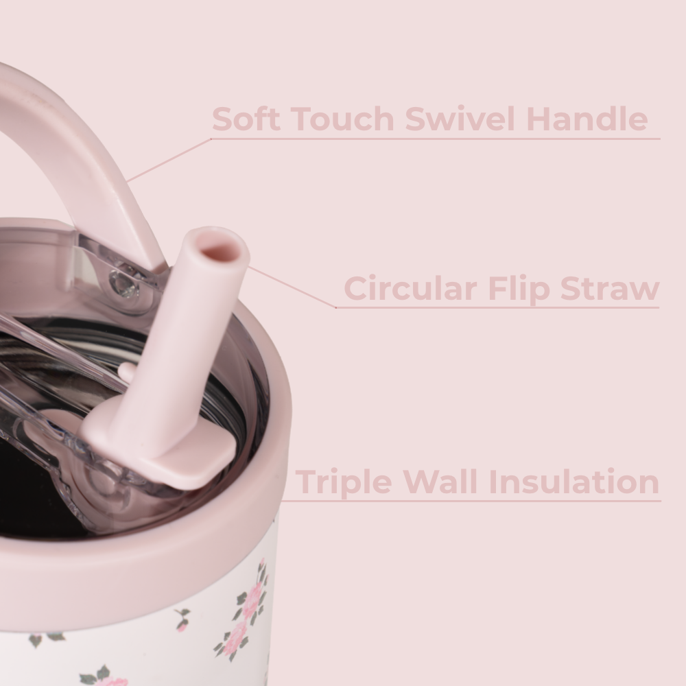 Designed for active lifestyles, it’s completely leakproof with the straw down, fitted with a circular flip straw for smooth sipping, and built with a cupholder-friendly tapered base. Ergonomic side grips provide a steady hold during activity, while the bucket handle and protective rubber base add durability and everyday convenience.